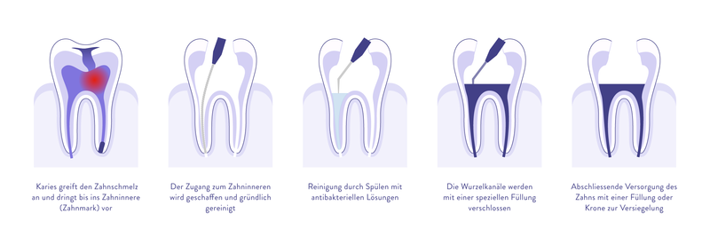 Nachdem der Zahn vollständig betäubt ist, öffnet der Zahnarzt die Zahnkrone. Mit einem Mikroskop begutachtet er das Behandlungsgebiet und beginnt dann mit dem Säubern der Wurzelkanäle. Entzündlich verändertes Gewebe, Zahnmark und der Zahnnerv werden mechanisch entfernt oder mittels Lasertechnologie verdampft.